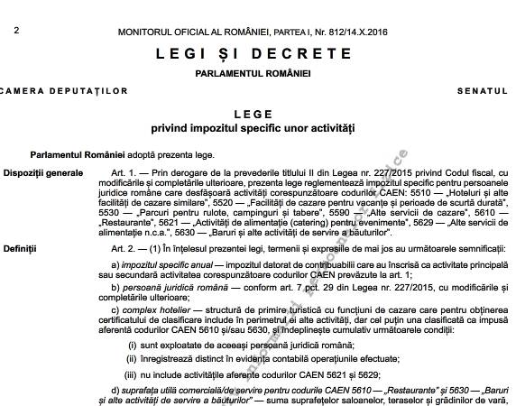Legea 170/2016 – privind impozitul specific unor activități (CAEN – 5510, 5520, 5530, 5590, 5610, 5621, 5629, 5630)