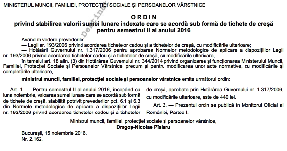 OMMFPSPV 2162/2016 – stabilirea valorii sumei lunare indexate care se acordă sub formă de tichete de creşă