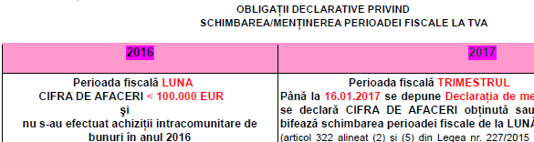 Obligații declarative privind schimbarea/menținerea perioadei fiscale la TVA – 2016 comparativ cu 2017 (util)