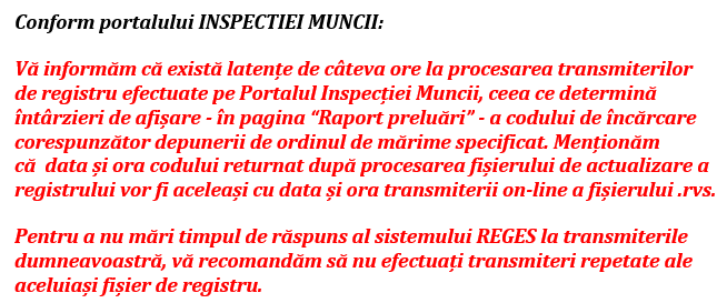 ATENȚIE – exista latențe de câteva ore la procesarea transmiterilor de REVISAL efectuate pe Portalul Inspecției Muncii