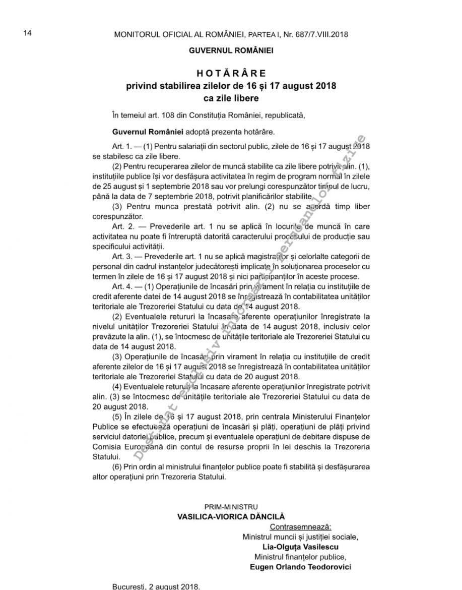 HG 595/2018 – stabilirea zilelor de 16 și 17 august 2018 ca zile libere
