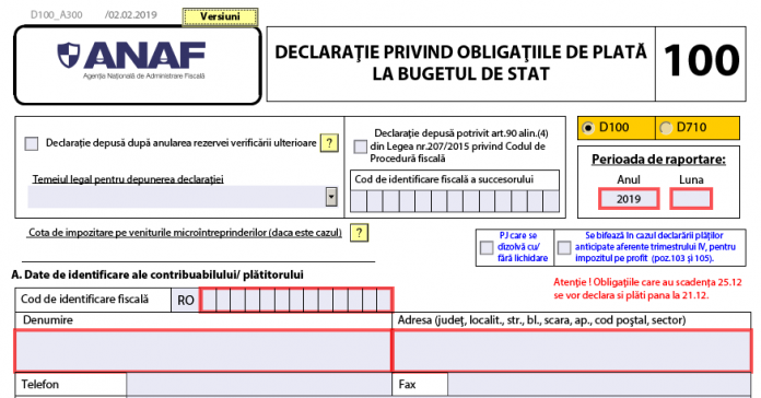 Pe site-ul oficial al ANAF (anaf.ro) a fost publicat PDF-ul inteligent necesar pentru generarea D 100 – Declaraţie privind obligaţiile de plată la bugetul de stat, conform OPANAF nr. 3105/11.12.2018, valabil începand cu 01/2019.