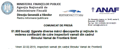 Vineri 22.02.2019, inspectorii vamali din cadrul Biroului Vamal de Frontieră Siret, urmare controlului vamal de specialitate efectuat asupra bagajelor unui cetățean român de naționalitate ucraineană, care circula intr-un microbuz pe ruta Ucraina – România, au descoperit şi confiscat un număr de 47.800 bucăţi ţigarete Rothmans și 4.000 bucăți țigarete Davidoff cu timbru de Ucraina, ascunse în scopul sustragerii de la vămuire. Țigările au fost disimulate în cutii cu biscuiți.