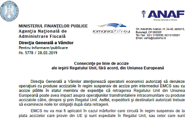 Direcţia Generală a Vămilor atenţionează operatorii economici autorizaţi să deruleze operaţiuni cu produse accizabile în regim suspensiv de accize prin intermediul EMCS sau cu accize plătite în statul membru de expediţie că retragerea Regatului Unit din Uniunea Europeană poate avea impact asupra operaţiunilor transfrontaliere intracomunitare cu produse accizabile către, dinspre şi prin Regatul Unit.