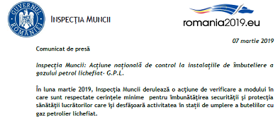 În luna martie 2019, Inspecţia Muncii derulează o acţiune de verificare a modului în care sunt respectate cerinţele minime pentru îmbunătăţirea securităţii şi protecţia sănătăţii lucrătorilor care îşi desfăşoară activitatea în stații de umplere a buteliilor cu gaz petrolier lichefiat.