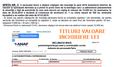 […] 2019) – venituri din transferul titlurilor de valoare și din închiriere în lei – click aici – Declarația Unică (speță oficială ANAF 2019) – venituri din închiriere în lei […]