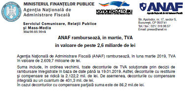[…] – ANAF rambursează (în martie) – toate deconturile de TVA soluționate prin decizii de rambursare, înregistrate în baza de date până la 19.01.2019 – CLICK AICI […]