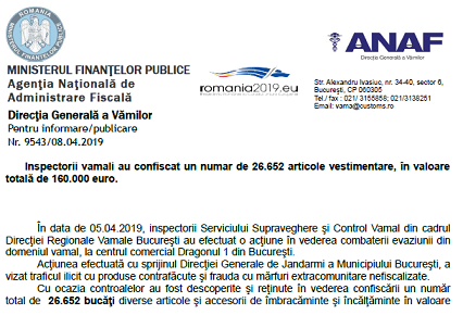 Acţiunea efectuată cu sprijinul Direcţiei Generale de Jandarmi a Municipiului Bucureşti, a vizat traficul ilicit cu produse contrafăcute şi frauda cu mărfuri extracomunitare nefiscalizate. Cu ocazia controalelor au fost descoperite şi reţinute în vederea confiscării un număr total de 26.652 bucăţi diverse articole şi accesorii de îmbracăminte şi încălţăminte în valoare totală estimată de aproximativ 160.000 euro.