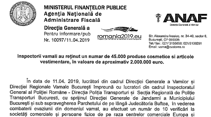 lnspectorii vamali au retinut un numar de 45.000 produse cosmetice si articole vestimentare, in valoare de aproximativ 2.000.000 euro. In data de 11.04. 2019, lucratori din cadrul Directiei Generale a Vamilor si Directiei Regionale Vamale Bucuresti impreuna cu lucratori din cadrul lnspectoratului General al Politiei Romane – Directia Politia Transporturi si Sectia Regionala de Politie Transporturi Bucuresti, cu sprijinul Directiei Generale de Jandarmi a Municipiului Bucuresti si sub supravegherea Parchetului de pe langa Judecatoria Buftea, in vederea combaterii evaziunii din domeniul vamal, au efectuat un numar de 10 verificari la societati comerciale si persoane fizice de pe raza centrelor comerciale Europa si Dragonul Rosu.