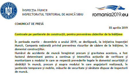 În perioada martie – decembrie a anului 2019, se desfășoară, la inițiativa Inspecției Muncii, Campania națională privind prevenirea riscurilor de cădere de la înălțime, în domeniul construcțiilor.