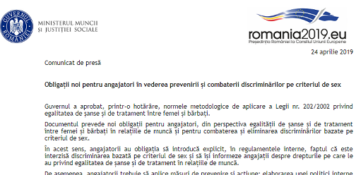 Guvernul a aprobat, printr-o hotărâre, normele metodologice de aplicare a Legii nr. 202/2002 privind egalitatea de șanse şi de tratament între femei şi bărbaţi. Documentul prevede noi obligații pentru angajatori, din perspectiva egalității de șanse și de tratament între femei și bărbați în relațiile de muncă și pentru combaterea și eliminarea discriminărilor bazate pe criteriul de sex.
