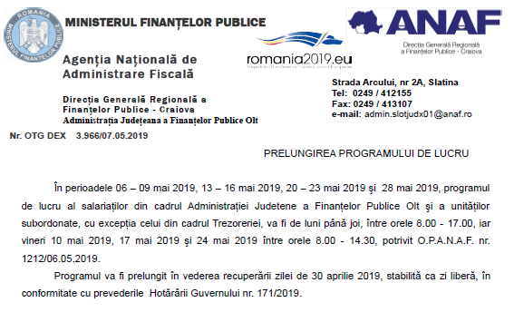 […] – OPANAF nr. 1212/06.05.2019 – prelungirea programului de lucru al salariaților din ANAF – CLICK AICI […]