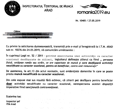 Solicitand opinia colegilor de pe grup, referitor la munca desfasurata la un bar cu zilieri – si primind mai multe pareri complet diferite, o stimata colega (careia ii multumim pentru material) – a solicitat lamuriri da la ITM Arad in acest sens.