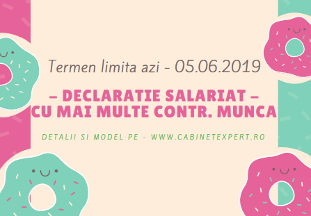 Salariații part time sau cu plata în acord trebuie să depună până azi, 05 IUNIE 2019, la fiecare angajator, câte o declarație pe propria răspundere că au obținut în MAI 2019, în total, cel puțin 2.080 de lei brut.
