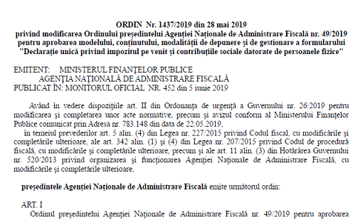 Va informam pe aceasta cale ca, in Monitorul Oficial nr. 452 din 5 iunie 2019, a fost publicat, Ordinul preşedintelui ANAF nr. 1437 din 28 mai 2019 privind modificarea Ordinului preşedintelui Agenţiei Naţionale de Administrare Fiscală nr. 49/2019 pentru aprobarea modelului, conţinutului, modalităţii de depunere şi de gestionare a formularului „Declaraţie unică privind impozitul pe venit şi contribuţiile sociale datorate de persoanele fizice” .