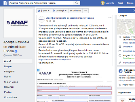 Avand in vedere cele de mai sus, ANAF va așteapta miercuri, 12 iunie 2019 începând cu ora 09:00, pe această pagină Facebook – https://www.facebook.com/www.ANAF.ro/ . Potrivit institutiei – cu un LIKE sau SHARE puteți ajuta să se faca cunoscută tema acestei sesiuni. – ceea ce va recomandam si noi.