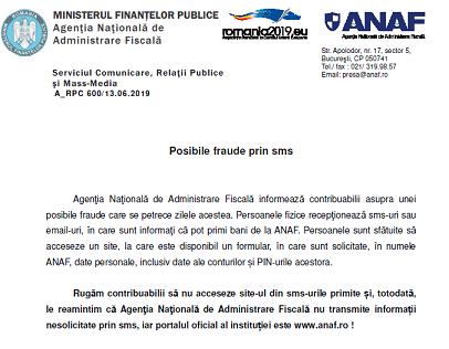 ANAF roaga contribuabilii să nu acceseze site-ul din sms-urile primite și, totodată, le reaminteste că Agenţia Naţională de Administrare Fiscală nu transmite informații nesolicitate prin sms, iar portalul oficial al instituției este www.anaf.ro !