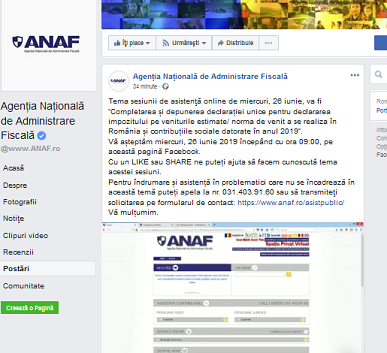 Avand in vedere cele de mai sus, ANAF va așteapta miercuri, 26 iunie 2019 începând cu ora 09:00, pe această pagină Facebook – https://www.facebook.com/www.ANAF.ro/ . Potrivit institutiei – cu un LIKE sau SHARE puteți ajuta să se faca cunoscută tema acestei sesiuni. – ceea ce va recomandam si noi.