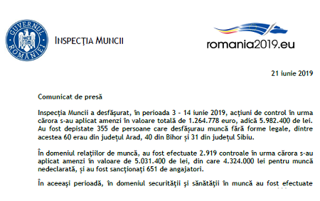 Inspecţia Muncii a desfăşurat, în perioada 3 – 14 iunie 2019, acţiuni de control în urma cărora s-au aplicat amenzi în valoare totală de 1.264.778 euro, adică 5.982.400 de lei. Au fost depistate 355 de persoane care desfășurau muncă fără forme legale, dintre acestea 60 erau din județul Arad, 40 din Bihor și 31 din județul Sibiu.