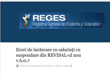 […] erori de încărcare cu salariați cu suspendare – din REVISAL-ul nou v. 6.0.7 – click aici – NEWS – rezolvare mesaj de eroare la intrarea în Revisal (Eroare neprevazuta … […]