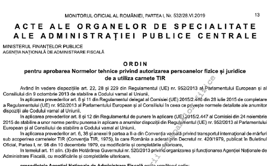 Va informam pe aceasta cale ca, in Monitorul Oficial nr. 532 din 28.06.2019, a fost publicat Ordinul Presedintelui Agenției Naționale de Administrare Fiscală nr. 1503 din 03 Iunie 2019 – pentru aprobarea Normelor tehnice privind autorizarea persoanelor fizice și juridice de a utiliza carnete TIR.