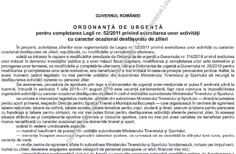 Va informam pe aceasta cale ca, in Monitorul Oficial nr. 552 din 4 iulie 2019, a fost publicata – Ordonanţa de urgenţă a Guvernului nr. 56 din 3 iulie 2019 pentru completarea Legii nr. 52/2011 privind exercitarea unor activităţi cu caracter ocazional desfăşurate de zilieri.
