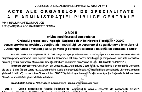 Va informam pe aceasta cale ca, in Monitorul Oficial nr. 561 din 9 iulie 2019, a fost publicat – Ordinul preşedintelui ANAF nr. 1886 din 3 iulie 2019 privind modificarea şi completarea Ordinului preşedintelui ANAF nr. 49/2019 pentru aprobarea modelului, conţinutului, modalităţii de depunere şi de gestionare a formularului „Declaraţie unică privind impozitul pe venit şi contribuţiile sociale datorate de persoanele fizice”.