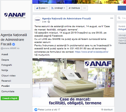 Tema sesiunii de asistenţă online de miercuri, 14 august, va fi „Case de marcat- obligații și termene”. In acest sens, ANAF vă așteptă miercuri, 14 august 2019 începând cu ora 09:00, pe pagina oficiala de Facebook a institutiei.