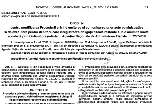 Va informam pe aceasta cale ca, in Monitorul Oficial nr. 673 din 13.08.2019, a fost publicat Ordinul Presedintelui Agenției Naționale de Administrare Fiscală nr. 2098 din 30 Iulie 2019 – pentru modificarea Procedurii privind emiterea și comunicarea unor acte administrative și de executare pentru debitorii care înregistrează obligații fiscale restante sub o anumită limită, aprobată prin Ordinul președintelui Agenției Naționale de Administrare Fiscală nr. 727/2019 .