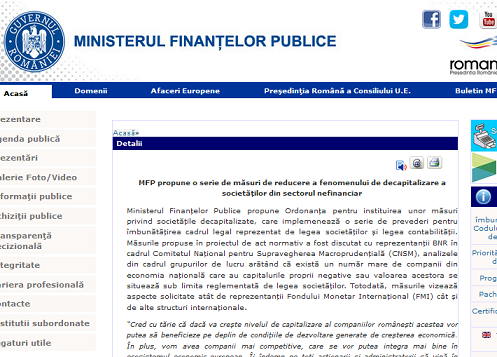 Ministerul Finanțelor Publice propune Ordonanța pentru instituirea unor măsuri privind societățile decapitalizate, care implemenează o serie de prevederi pentru îmbunătățirea cadrul legal reprezentat de legea societăților și legea contabilității. Măsurile propuse în proiectul de act normativ a fost discutat cu reprezentanții BNR în cadrul Comitetul Național pentru Supravegherea Macroprudențială (CNSM), analizele din cadrul grupurilor de lucru arătând că există un număr mare de companii din economia națională care au capitalurile proprii negative sau valoarea acestora se situează sub limita reglementată de legea societăților. Totodată, măsurile vizează aspecte solicitate atât de reprezentanții Fondului Monetar Internațional (FMI) cât și de alte structuri internaționale.