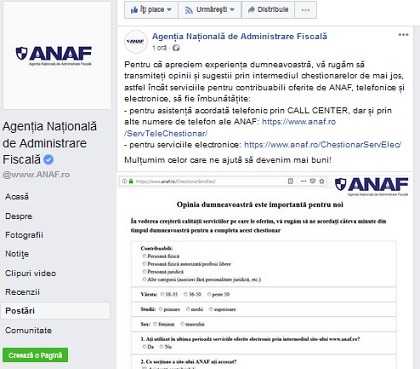 Intr-un comunicat oficial postat pe pagina oficiala de Facebook a ANAF, se precizeaza azi urmatoarele – pentru că apreciem experiența dumneavoastră, vă rugăm să transmiteți opinii și sugestii prin intermediul chestionarelor de mai jos, astfel încât serviciile pentru contribuabili oferite de ANAF, telefonice și electronice, să fie îmbunătățite.
