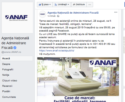 Pornind de la interesul foarte mare al problemei – tema sesiunii de asistenţă online de miercuri, 28 august, va fi „Case de marcat- obligații și termene”. In acest sens, ANAF vă așteptă miercuri, 28 august 2019 începând cu ora 09:00, pe pagina oficiala de Facebook a institutiei, dupa ce si saptamana trecuta (21.08.2019), dar si cu o saptamana inainte (14.08.2019) – s-a organizat astfel de sesiuni.