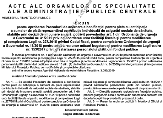 Va informam pe aceasta cale ca, in Monitorul Oficial nr. 708 din 28 august 2019, a fost publicat Ordinul Ministerului Finanțelor Publice nr. 2806 din 26 August 2019 – pentru aprobarea Procedurii de acordare a bonificației pentru plata cu anticipație a sumelor de plată reprezentând contribuție individuală de asigurări sociale de sănătate, stabilite prin decizii de impunere anuală, potrivit prevederilor art. 1 din Ordonanța de urgență a Guvernului nr. 31/2019 privind acordarea unor facilități fiscale și pentru modificarea și completarea Legii nr. 227/2015 privind Codul fiscal, pentru completarea Ordonanței de urgență a Guvernului nr. 11/2018 pentru adoptarea unor măsuri bugetare și pentru modificarea Legii-cadru nr. 153/2017 privind salarizarea personalului plătit din fonduri publice.
