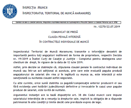 […] – IMPORTANT – clauza penală interzisă în contractele individuale de muncă (precizări oficiale ITM) – CLICK AICI […]
