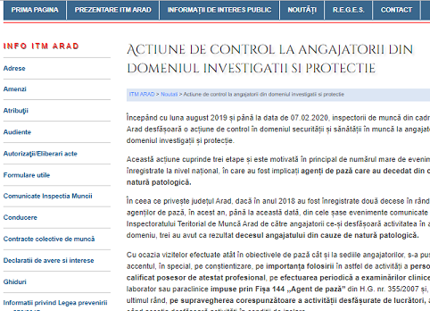 Începând cu luna august 2019 și până la data de 07.02.2020, inspectorii de muncă din cadrul ITM desfășoară o acțiune de control în domeniul securității și sănătății în muncă la angajatorii din domeniul investigații și protecție.