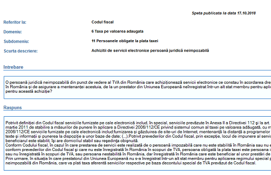 Sursa – anaf.ro – Speta publicata la data 17.10.2018 (Acesta nu reprezinta un act administrativ fiscal in sensul art. 41 din Codul de Procedura Fiscala sau un act administrativ de autoritate in sensul art. 1 din legea 554/2004 a contenciosului administrativ si nu este opozabil tertilor)