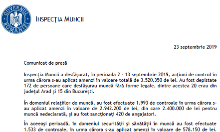 Inspecţia Muncii a desfăşurat, în perioada 2 – 13 septembrie 2019, acţiuni de control în urma cărora s-au aplicat amenzi în valoare totală de 3.520.350 de lei. Au fost depistate 172 de persoane care desfășurau muncă fără forme legale, dintre acestea 20 erau din județul Arad și 15 din București.