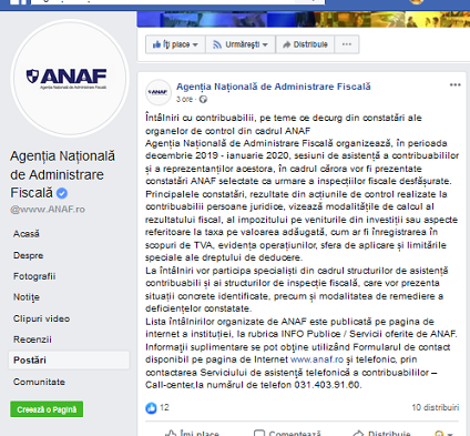 Agenția Națională de Administrare Fiscală organizează, în perioada decembrie 2019 – ianuarie 2020, sesiuni de asistență a contribuabililor și a reprezentanților acestora, în cadrul cărora vor fi prezentate constatări ANAF selectate ca urmare a inspecțiilor fiscale desfășurate.