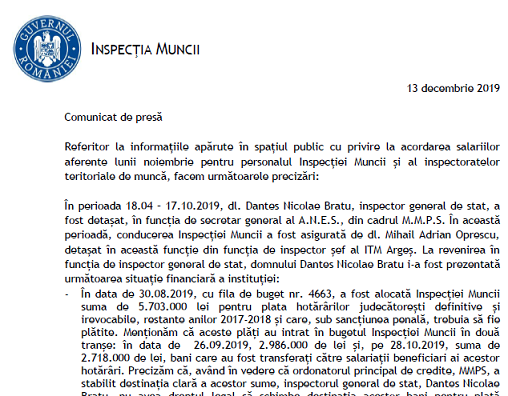 Menționăm că la niciuna dintre solicitările noastre enumerate mai sus, trimise MMPS, nu am primit niciun răspuns oficial, mai mult decât atât, ni s-a sugerat, de către Direcția Economică din MMPS, să plătim doar salariile nete, urmând ca sumele aferente contribuțiilor sociale să fie amânate. Inspectorul general de stat, Dantes Nicolae Bratu, și conducerea Inspecției Muncii nu au fost de acord cu această soluție propusă, fapt pentru care ne-am adresat direct ministrului muncii, prin adresele nr. 1389/12.12.2019 și 1399/13.12.2019, solicitând sprijin pentru obținerea sumelor necesare – potrivit Insp. Mun.