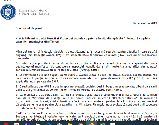 1. La rectificarea din luna august, ministrul PSD, Marius Budăi, a decis, de comun acord cu cei din conducerea de atunci a Inspecției Muncii, achitarea sumelor rezultate din litigiile de muncă din 2017 și 2018, dar, fără explicație, nu și pe cele din 2019.