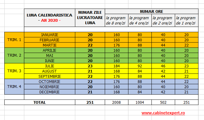 Câte zile lucrătoare sunt în fiecare luna din anul 2020 (inclusiv detaliere pe ore lucrătoare) ?