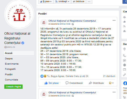 ONRC informeaza că, în perioada 25 decembrie 2019 – 17 ianuarie 2020, programul de lucru cu publicul al Oficiului Naţional al Registrului Comerţului şi al oficiilor registrului comerţului de pe lângă tribunale va fi modificat ca urmare a declarării zilelor de 27 decembrie 2019...Programul de lucru cu publicul al ONRC - în perioada 25 decembrie 2019 – 17 ianuarie 2020 (prelungit)