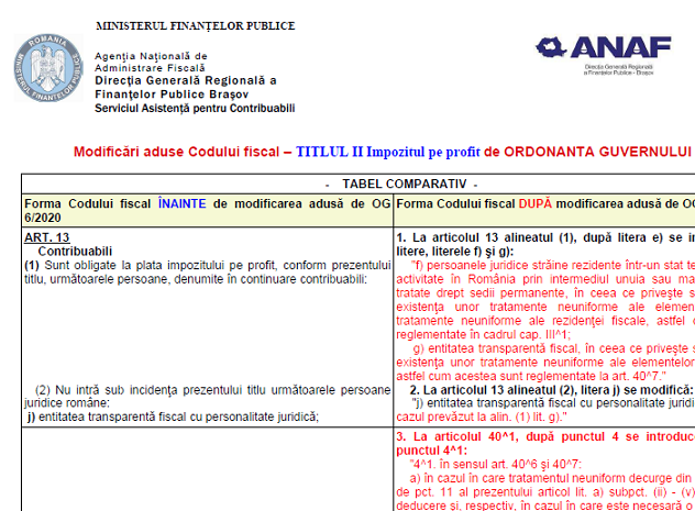 Va supunem atentiei un material oficial (9 pagini) – elaborat de DGRFP Brasov (institutie careia ii multumim pentru posibilitatea preluarii informatiilor) – ce prezinta sub forma de tabel comparativ, o serie de informatii cu privire la modificările aduse aduse Codului fiscal – Titlul II Impozitul pe profit de Ordonanţa Guvernului 6/2020 (material publicat în data de 06.02.2020).