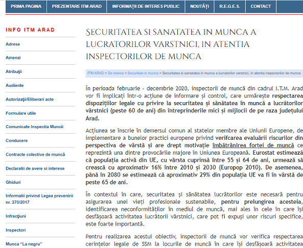În perioada februarie – decembrie 2020, inspectorii de muncă din cadrul I.T.M. vor fi implicați într-o acțiune de informare și control, care urmărește respectarea dispozițiilor legale cu privire la securitatea și sănătatea în muncă a lucrătorilor vârstnici (peste 60 de ani) din întreprinderile mici și mijlocii.