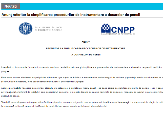 Intr-un comunicat oficial publicat azi pe site-ul oficial al Casei Naționale de Pensii Publice, se precizeaza ca – incepând cu luna martie, în cadrul procesului continuu de debirocratizare și simplificare a procedurilor de instrumentare a dosarelor de pensii, realizăm un nou progres.