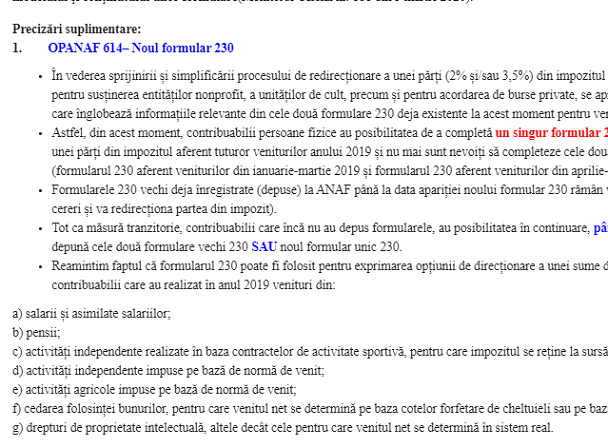 – Astfel, din acest moment, contribuabilii persoane fizice au posibilitatea de a completă un singur formular 230 (cel nou) pentru redirecționarea unei părți din impozitul aferent tuturor veniturilor anului 2019 și nu mai sunt nevoiți să completeze cele două formulare deja existente (formularul 230 aferent veniturilor din ianuarie-martie 2019 și formularul 230 aferent veniturilor din aprilie-decembrie 2019).