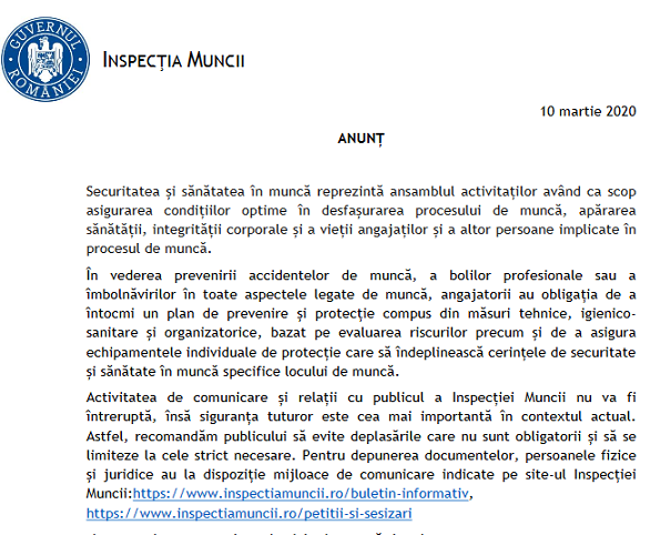 Activitatea de comunicare și relații cu publicul a Inspecției Muncii nu va fi întreruptă, însă siguranța tuturor este cea mai importantă în contextul actual. Astfel, recomandăm publicului să evite deplasările care nu sunt obligatorii și să se limiteze la cele strict necesare. Pentru depunerea documentelor, persoanele fizice și juridice au la dispoziție mijloace de comunicare indicate pe site-ul Inspecției Muncii: https://www.inspectiamuncii.ro/buletin-informativ, https://www.inspectiamuncii.ro/petitii-si-sesizari și, pentru inspectoratele teritoriale de muncă, la adresa: https://www.inspectiamuncii.ro/contact.