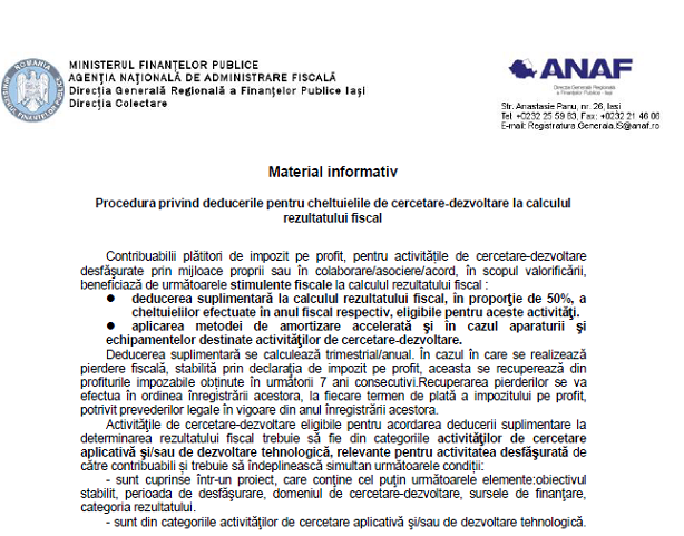 Stimati colegi, va supunem atentiei un material oficial (2 pagini) – via AJFP Neamt (institutie careia ii multumim pentur posibilitatea preluarii informatiilor) – ce prezinta o serie de informatii cu privire la procedura privind deducerile pentru cheltuielile de cercetare-dezvoltare – la calculul rezultatului fiscal.