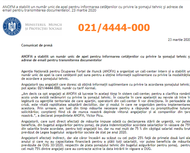 Angajatorii sau angajații care doresc să obțină informații suplimentare cu privire la acordarea șomajului tehnic, pot apela: 021/4444-000, număr cu tarif normal.