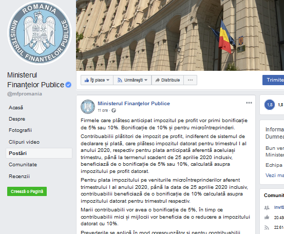 Pentru plata impozitului pe veniturile microîntreprinderilor aferent trimestrului I al anului 2020, pânã la data de 25 aprilie 2020 inclusiv, contribuabilii beneficiazã de o bonificație de 10% calculatã asupra impozitului datorat pentru trimestrul respectiv.